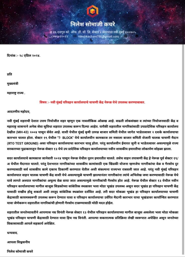 शहरातील जनतेच्यावतीने आपणास नम्र विनंती करण्यात येते असे पत्र सामाजिक कार्यकर्ते निलेश कचरे यांनी परिवहन मंत्री व राज्याचे मुख्यमंत्री एकनाथ शिंदे यांना दिले आहे , नेरूळ सेक्टर १३ येथील परिवहन कार्यालयाच्या मागील बाजूस असलेला भला मोठा मोकळा भूखंड परिवहन चाचणी केंद्रासाठी देण्यात यावा हिच नम्र विनंती. आपल्या सकारात्मक प्रतिक्रिया लेखी स्वरूपात अपेक्षित असून जनतेच्या विकासासाठी आपले सहकार्य अपेक्षित. असे मत पत्राद्वारे निलेश कचरे यांनी दिले आहे असे पत्रकारांना बोलताना सांगितले आहे