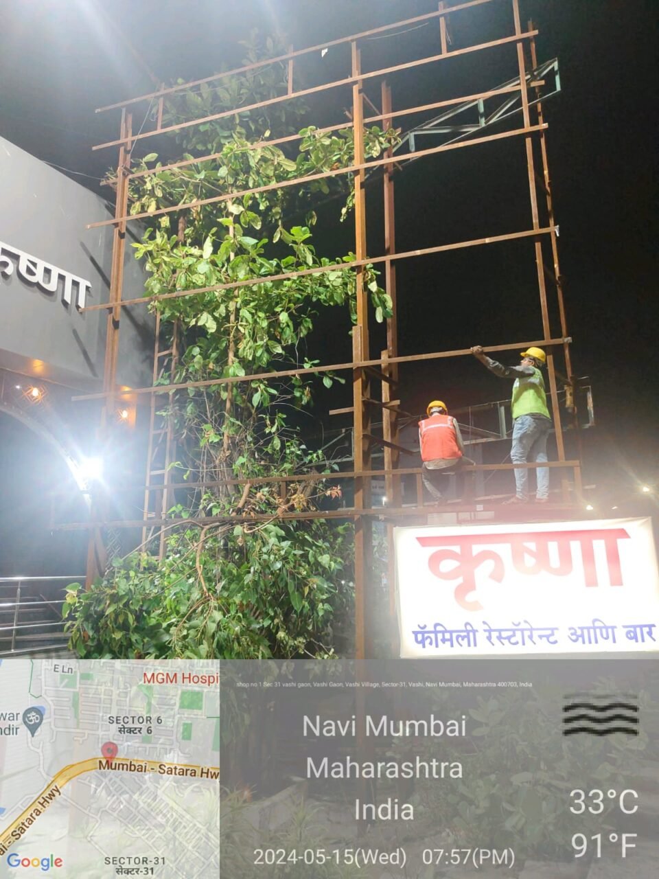 आकस्मिक वादळामुळे व पर्जन्यवृष्टीमुळे नवी मुंबई महानगरपालिका क्षेत्रात उद्भवलेली आपत्तीजनक परिस्थिती तसेच मुंबईतील घाटकोपर येथे घडलेली मोठे होर्डिंग्ज कोसळल्याची दुर्घटना याचे गांभीर्य लक्षात घेऊन नवी मुंबई महानगरपालिका आयुक्त डॉ. कैलास शिंदे यांनी दि. १४ मे रोजी तातडीने दूरदृश्य प्रणालीव्दारे अधिकारीवर्गाची बैठक घेत शहरातील परिस्थिती जाणून घेतली तसेच कालचा प्रसंग लक्षात घेऊन आपत्ती सांगून येत नाही त्यामुळे 24×7 सतर्क राहण्याचे निर्देश दिले.या अनुषंगाने 13 तारखेला घडलेल्या घटनेनंतर वाशी विभाग सहा. आयुक्त सागर मोरे यांच्या मार्गदर्शनाखाली वाशी गाव येथे कृष्णा फॅमिली रेस्टॉरंट आणि बार जवळ विनापरवानगी उभारण्यात आलेल्या होर्डिंगवर निष्काशनाची कारवाई…करण्यात आली व अशा विना परवाना असणाऱ्या सर्व होर्डिंगवर कडक कारवाई करणार