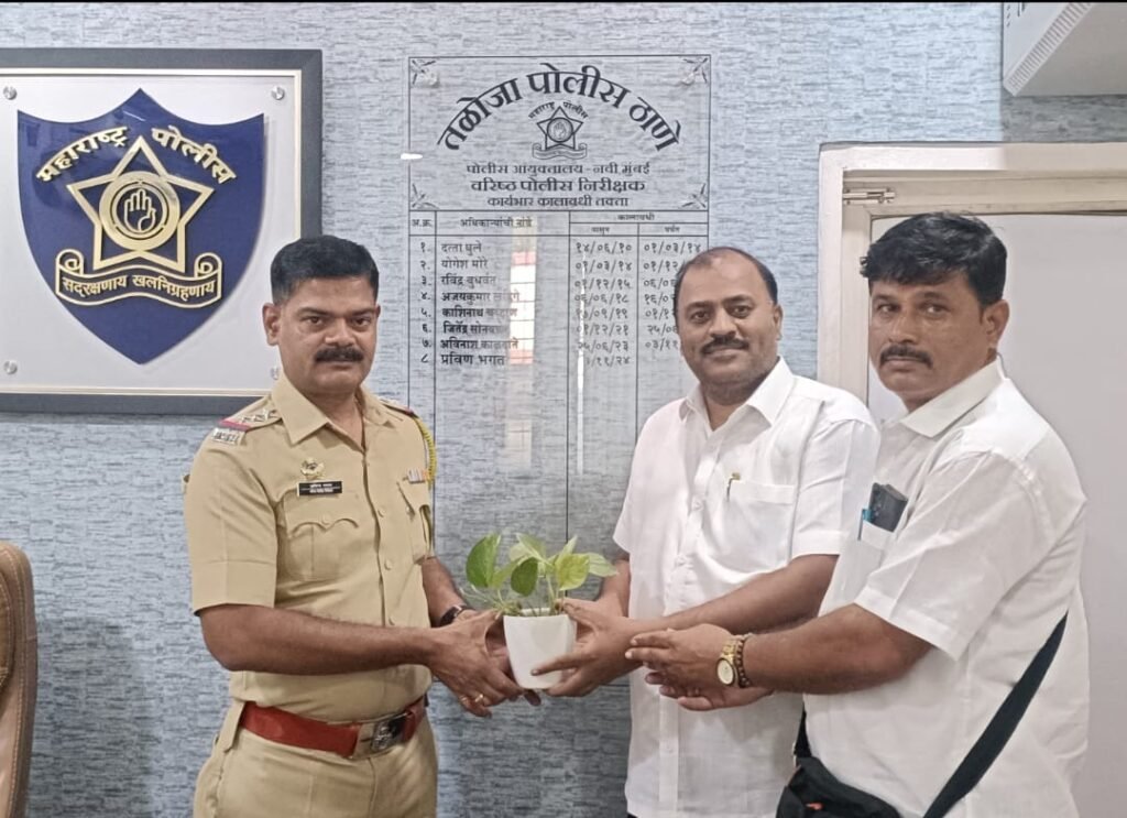 तळोज्या पोलीस स्टेशन येथे वरिष्ठ पोलीस निरीक्षक प्रवीण भगत यांची नियुक्ती झाल्यानंतर जनतेचा सावधान महाराष्ट्र वृत्तपत्राचे संपादक राजेंद्र बोडके व कार्यकारी संपादक कुंडलिक काणगुडे यांनी त्यांना शुभेच्छा दिल्या व तळोज्या विभागातील समस्या बद्दल विचारले असता त्यांनी माहिती देताना सांगितले की तळोज्या विभागामधील अनाधिकृत पणे चाललेले व्यवसाय चोरी घरफोडी व गुन्हेगारी प्रवृत्तीच्या सर्वच गुन्हेगारांवर अंकुश ठेवून गुन्हेगारीला आळा घालण्याचा काम करणार असल्याचे त्यांनी सांगितले पोलीस हे नागरिकांचे मित्रच असतात नागरिकांनीही जागृत राहून पोलिसांना सहकार्य करण्याची गरज आहे आजूबाजूच्या विभागांमध्ये काही चुकीचा गुन्हा घडत असेल तर नागरिकांची ही नैतिक जबाबदारी आहे पोलिसांना कळविने, पोलीस हे नागरिकांच्या सेवेसाठी नेहमीच तत्पर असतात तळोज्या विभागात गुन्हेगारीला आळा घालण्यासाठी मी आणि माझी संपूर्ण टीम तत्पर असणार आहे तळोज्या विभागातील गुन्हेगारी प्रवृत्तीच्या अनेक गुन्हेगारांना चाप बसणार अशी चर्चा तळोज्या विभागात चालली आहे.