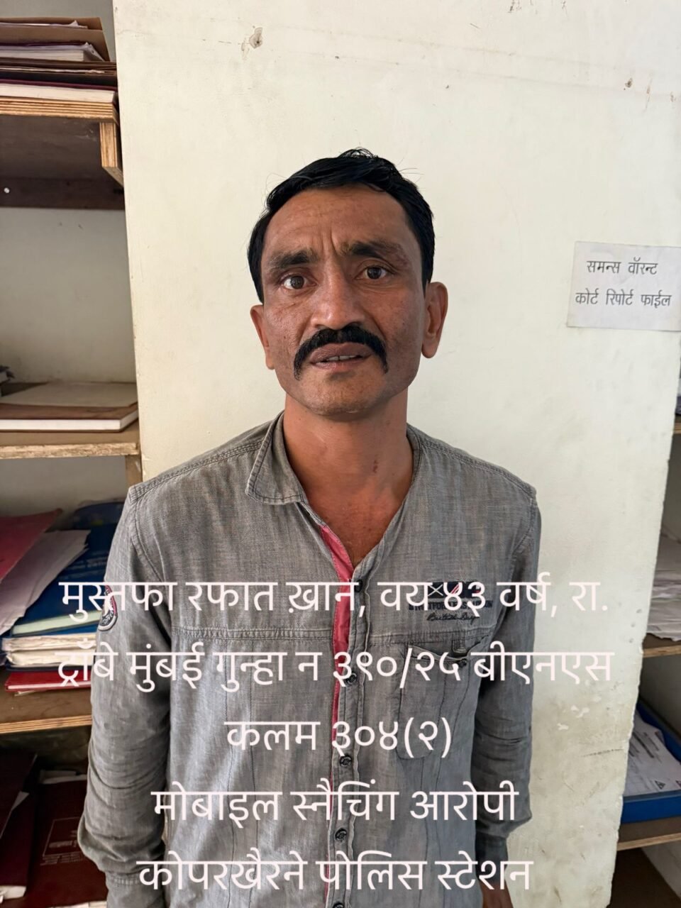 नवी मुंबई – कोपरखैरणे पोलीस ठाण्याच्या हद्दीत मोबाईल स्नॅचिंगचा गुन्हा दिनांक २४ एप्रिल २०२५ रोजी CR No. 390/2025, BNS कलम 304(2) नुसार नोंद करण्यात आला. सदर गुन्ह्यात सराईत गुन्हेगार मुस्तफा रफिक खान (वय ४२ वर्षे) याने एका व्यक्तीचा Vivo कंपनीचा अंदाजे १५,०००/- रुपये किमतीचा मोबाईल फोन जबरदस्तीने चोरून नेला.